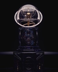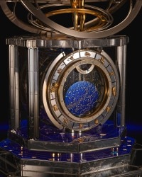 The glass dome is over 40 cm in diameter. A star chart of the skies above Geneva at Vacheron Constantin’s founding is painted within, its accuracy ensured by the Geneva Observatory. A retrograde 3D moon circles on its dedicated track, while a symbolic Sun hangs aloft, and night follows day at the automaton’s feet. A curved grid of titanium holds scales for hours (Roman numerals) and minutes (Arabic numerals).