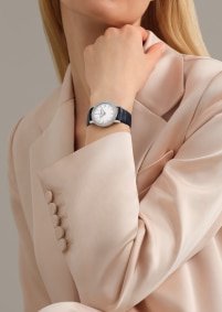 Dial description Silver-toned opaline dial. Railway minute-track. 18K gold dauphine-style hour/minute hands and applied hour-markers.