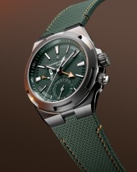 Zifferblattbeschreibung Grünes Zifferblatt mit dreifacher Veredelung: genarbte Mitte, kreisförmig satinierte innere Minutenskala, lackierte äußere Minutenskala. Azurierte Zähler. Orangefarbene Zeiger für die zweite Zeitzone. Zeiger für Stunden und Minuten sowie Indizes aus 18-karätigem Weißgold, mit blauer SuperLuminova®-Beschichtung.