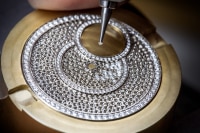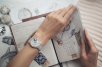 Inspirée de la Haute Couture, cette montre joaillère est mise en lumière par un boîtier en or gris 750/1000, un cadran et un bracelet tapissés de 1377 diamants. La phase de lune est précieusement mise en lumière à 13h30, là où deux lunes en nacre se révèlent à tour de rôle derrière les nuages de glace saphir. Une composition harmonieuse influencée par le patrimoine de la Maison et cadencée par le calibre manufacture 1088 L phase de lune automatique, dont les terminaisons raffinées se révèlent à travers le fond saphir.