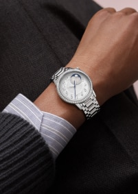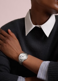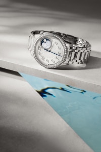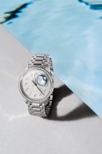 此高級訂製時裝腕錶的錶盤彰顯非凡美學,使人聯想起絲綢的精緻摺皺裝飾,透過傳統織錦工藝完美呈現。1時和2時位置之間的月相圓環鑲嵌36顆圓形切割鑽石,兩個金色月亮或高懸星空,或隱藏於珍珠貝母雲海,互相追逐,展現月相盈虧。此精鋼腕錶鑲嵌58顆圓形切割鑽石和一顆凸圓形月光石,搭配金屬錶鏈,猶如第二層肌膚般完美貼合手腕。