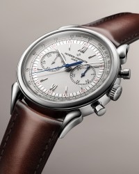 Cette montre en acier rend hommage aux mythiques et affirmées « cornes de vaches » qui ornaient le chronographe à remontage manuel de 1955, référence 6087, le premier chronographe étanche manufacturé par Vacheron Constantin. Peinte sur le cadran, l'échelle tachymétrique permet de déterminer une vitesse moyenne grâce à l’aiguille centrale du chronographe. Ce splendide calibre chronographe à roue à colonnes est estampillé du Poinçon de Genève, gage d'excellence et de fiabilité.